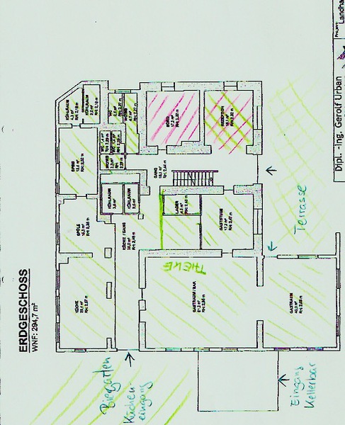Zum 270 qm großen Restaurant im Erdgeschoß gehört noch eine 70 qm große Bar im Untergeschoß. Mit bis zu 100 Sitzplätzen verteilt in 3 Gasträumen ist das Restaurant für sämtliche Feiern bestens geeignet. Moderne, große Küche und Lagerräume.