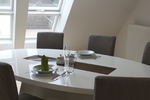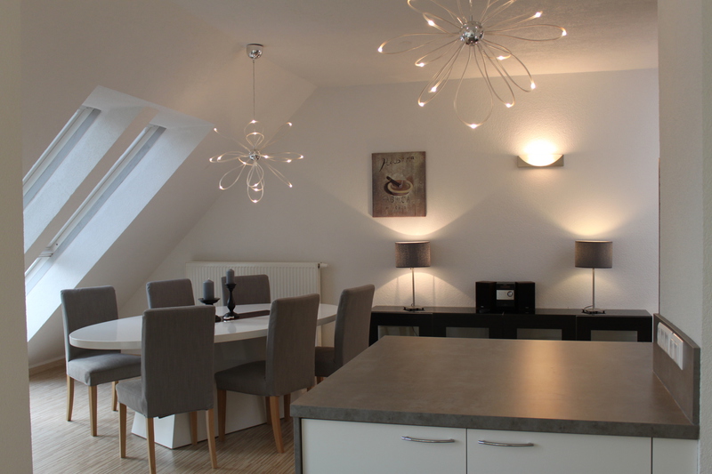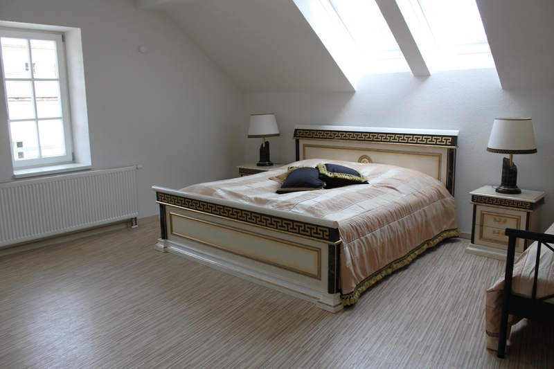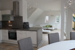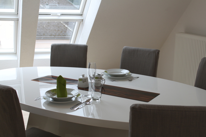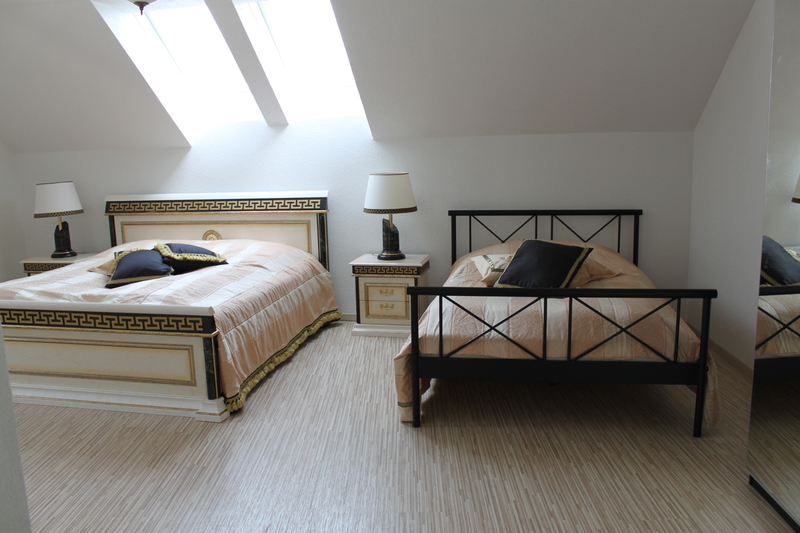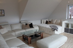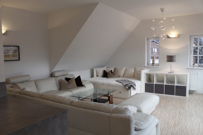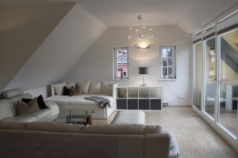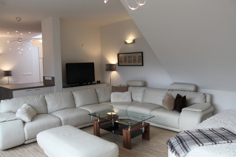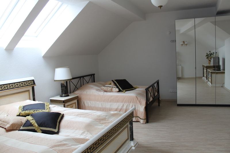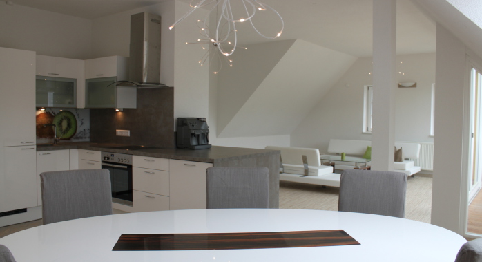 Dieses 118 qm große Appartement befindet sich im 3. Stock im Dachgeschoß der Villa. Die vielen Schrägen und die breite Fensterfront im Wohnzimmer verleihen der Wohnung eine elegante und eine besondere Atmosphäre.