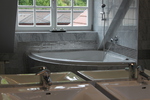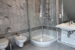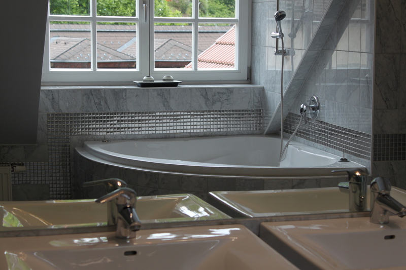 Das Badezimmer ist mit einem Doppelwaschtisch, Dusche, WC und einer Eckbadewanne ausgestattet.